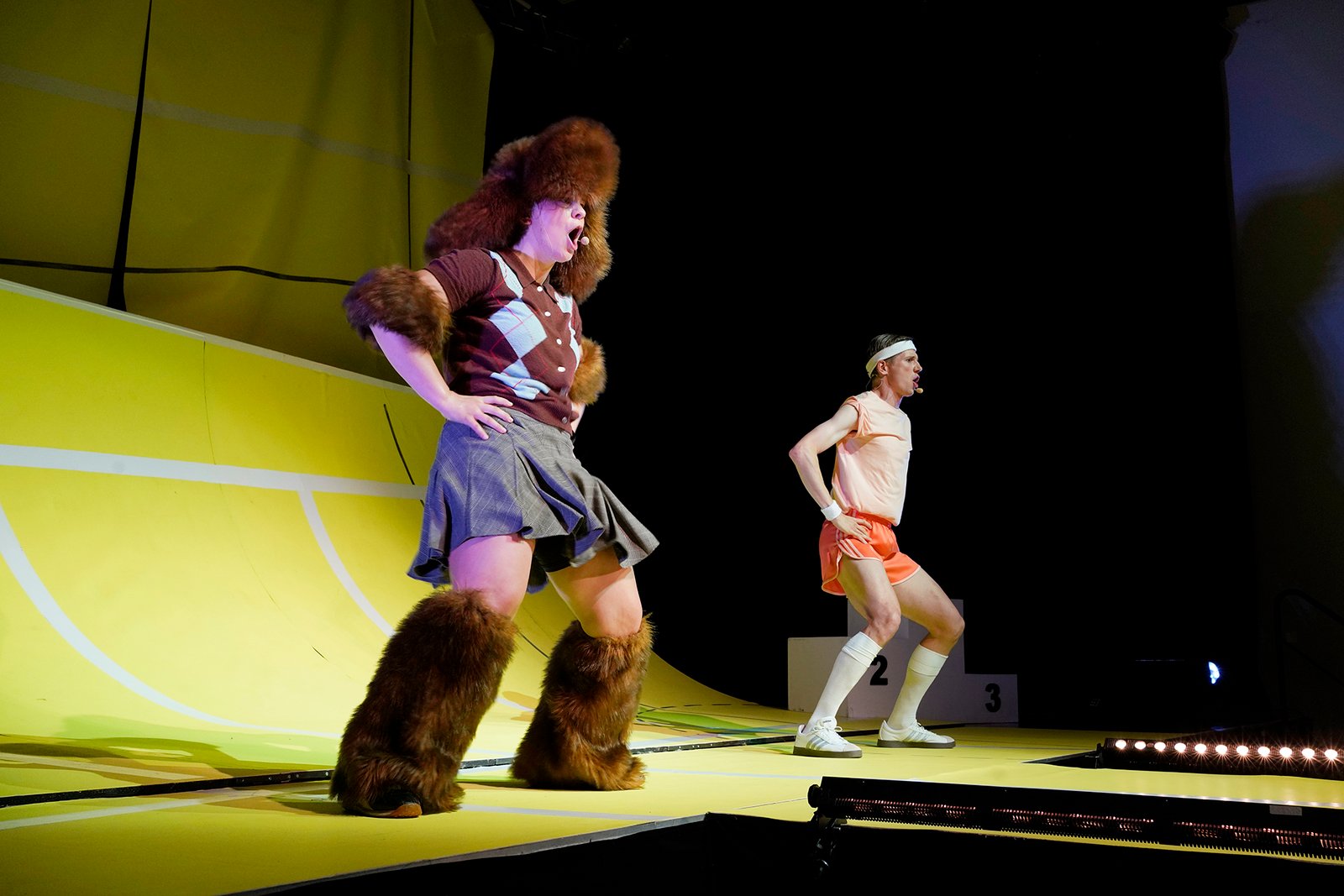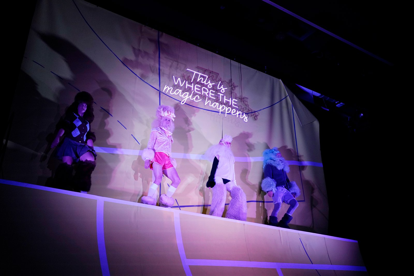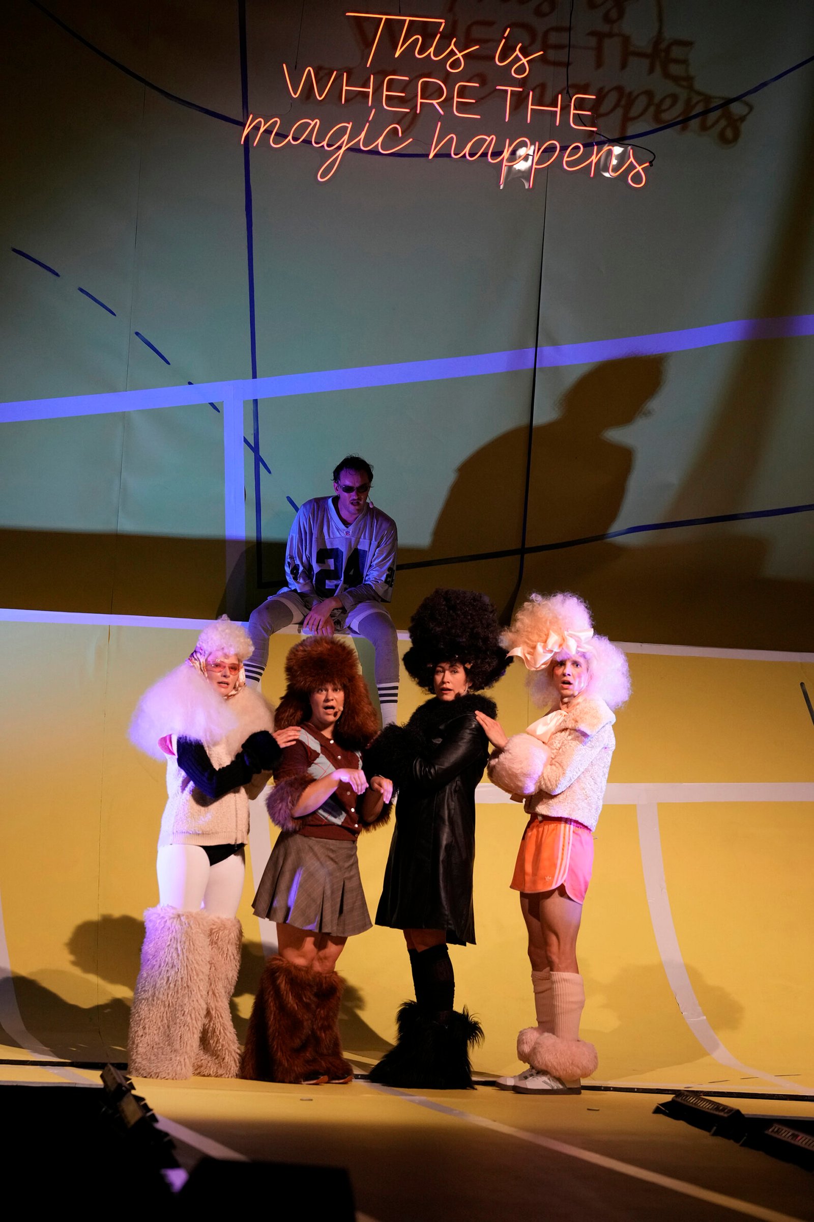 Das eineinhalbstündige Stück entfaltet sich in der Inszenierung von Felix Hafner auf einem langen Catwalk, der in eine Skaterrampe mündet. Die rhythmischen Sprechchöre sorgen für Tempo, die Musik von Nastasja Ronck gibt dem Text einen Rahmen. Respekt für das textsichere Ensemble, das tapfer tanzend unter den wolligen Pudelmützen schwitzt.